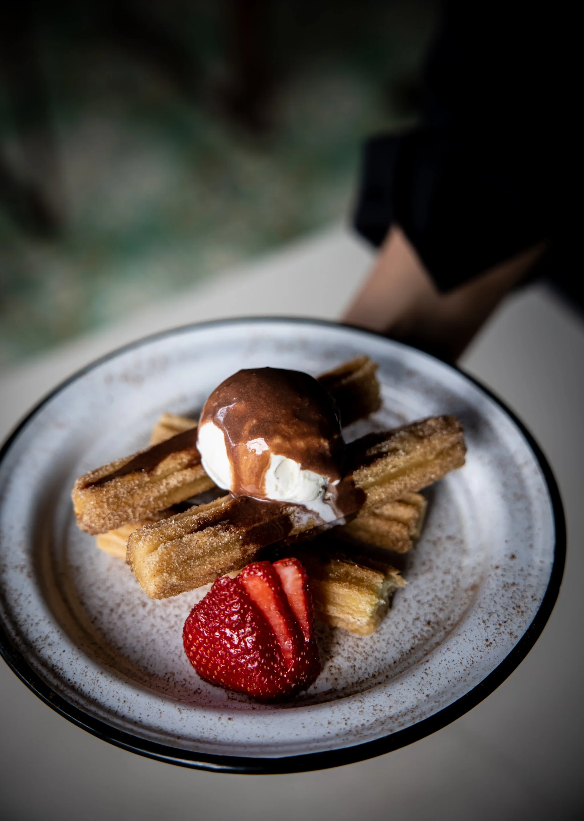 DESSERTSSERVED ALL DAY DESSERTSPlease inform your server of any allergies. An 18% gratuity will be added automatically for parties of 6 Prices do not include taxes DESSERTS $10 ELOTE CHEESECAKE Cake made with cream and soft cheese on graham cracker crumbs, topped with berries and sweet sauce. $10 $8 CAJETA FLAN Traditional burnt baked custard topped with caramel $8 $10 CHURROS BORRACHOS Fried dough stuffed with bavarian cream; dusted in cinnamon sugar. Topped with vanilla ice cream & tequila-hazelnut sauce. $10 $11 DESSERT COCKTAIL - CARAJILLO Served on the rocks. Liquor 43 and cold brew coffee $11